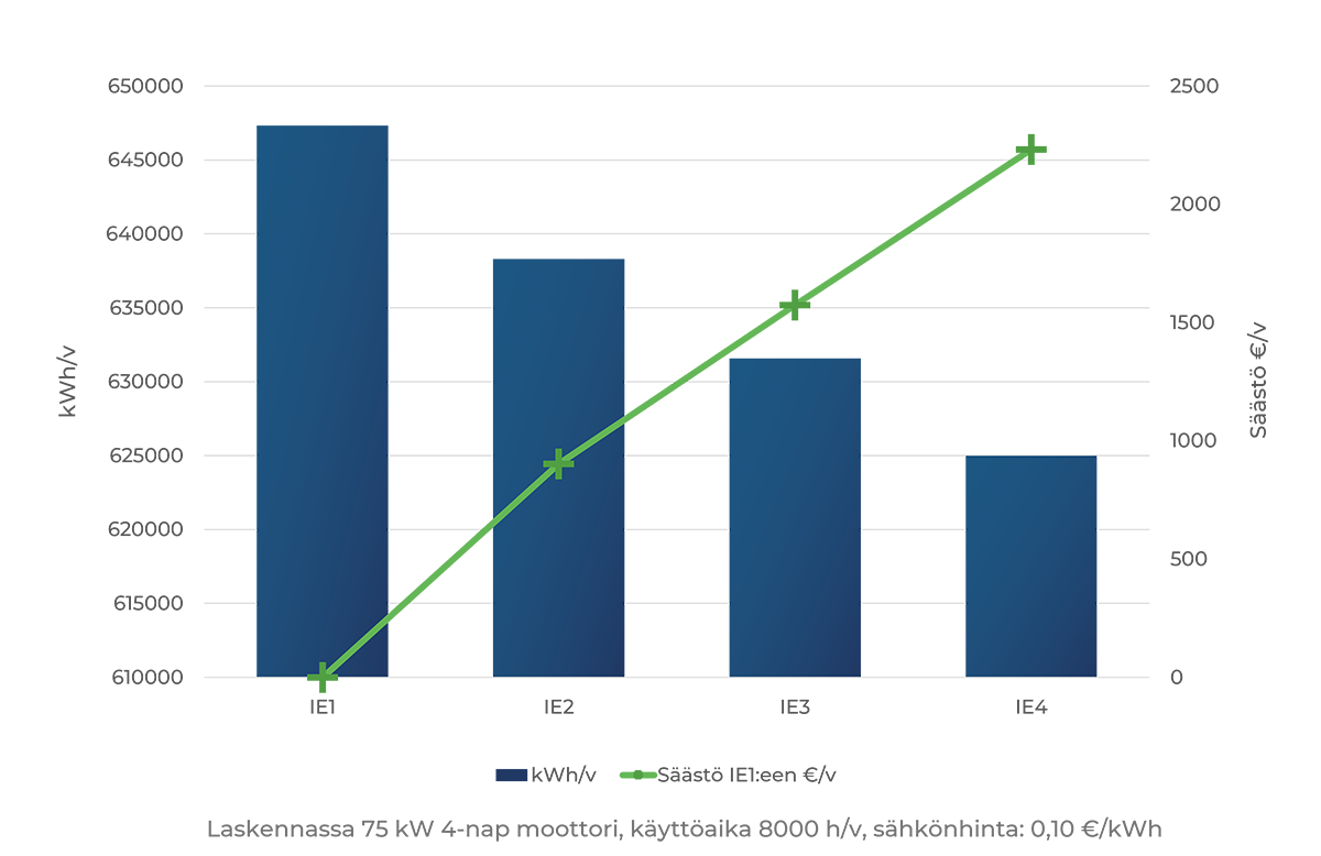 Sähkömoottorin energiatehokkuus vaikuttaa suoraan käyttökustannuksiin. Mitä suurempi teho ja mitä enemmän käyttötunteja, sitä merkittävämpi vaikutus hyötysuhteella on. Pienikin parannus hyötysuhteessa voi vuositasolla tarkoittaa huomattavia säästöjä, erityisesti jatkuvassa prosessikäytössä.